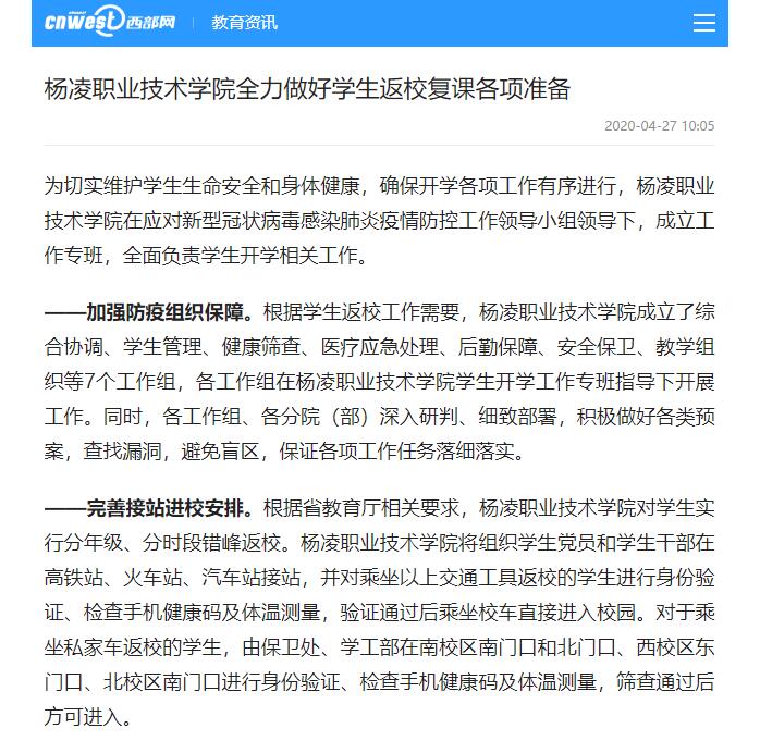 杨凌职院将按照“立体化统筹、网格化强责、亲情化服务、常态化防控”的原则,进一步细化工作方案、明确责任分工,确保疫情防控期间学生返校工作安全、平稳、有序。同时,提高服务意识,在做好学生健康安全防护教育的同时,为学生营造安全、温馨的学习生活环境。