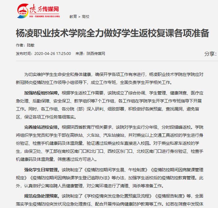 杨凌职院将按照“立体化统筹、网格化强责、亲情化服务、常态化防控”的原则,进一步细化工作方案、明确责任分工,确保疫情防控期间学生返校工作安全、平稳、有序。同时,提高服务意识,在做好学生健康安全防护教育的同时,为学生营造安全、温馨的学习生活环境。(通讯员 陆敏)