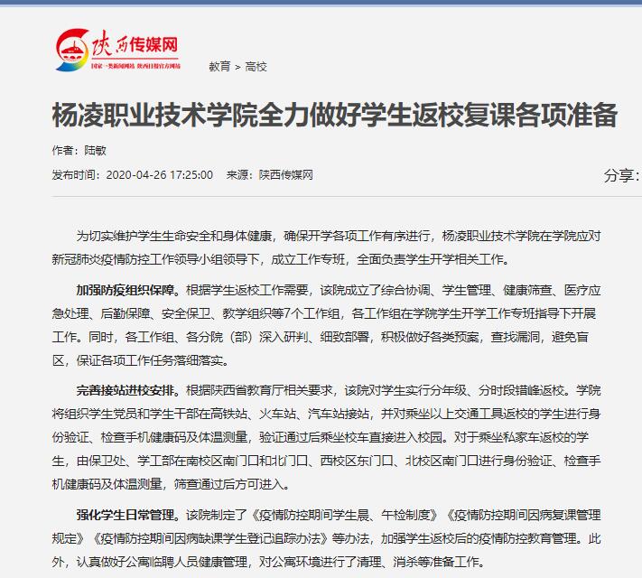 杨凌职院将按照“立体化统筹、网格化强责、亲情化服务、常态化防控”的原则,进一步细化工作方案、明确责任分工,确保疫情防控期间学生返校工作安全、平稳、有序。同时,提高服务意识,在做好学生健康安全防护教育的同时,为学生营造安全、温馨的学习生活环境。(通讯员 陆敏)