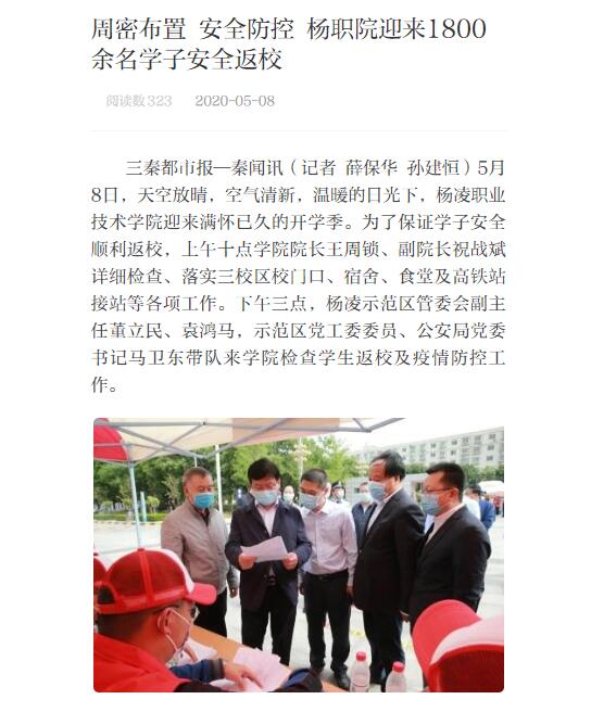 三秦都市报—秦闻讯(记者 薛保华 孙建恒)5月8日,天空放晴,空气清新,温暖的日光下,304am永利迎来满怀已久的开学季。为了保证学子安全顺利返校,上午十点学院院长王周锁、副院长祝战斌详细检查、落实三校区校门口、宿舍、食堂及高铁站接站等各项工作。下午三点,杨凌示范区管委会副主任董立民、袁鸿马,示范区党工委委员、公安局党委书记马卫东带队来学院检查学生返校及疫情防控工作。