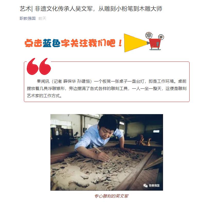 “木雕是一种民间工艺,流传久远,展现其蕴藏的由环保材质和工艺创造出的立体之美与手艺之巧。”吴文军告诉记者,2010年大学毕业后的他热衷于对雕刻艺术的追求,从工作中观察到木雕工艺的艺术价值,转而拜师求艺,度过三年学徒生涯。