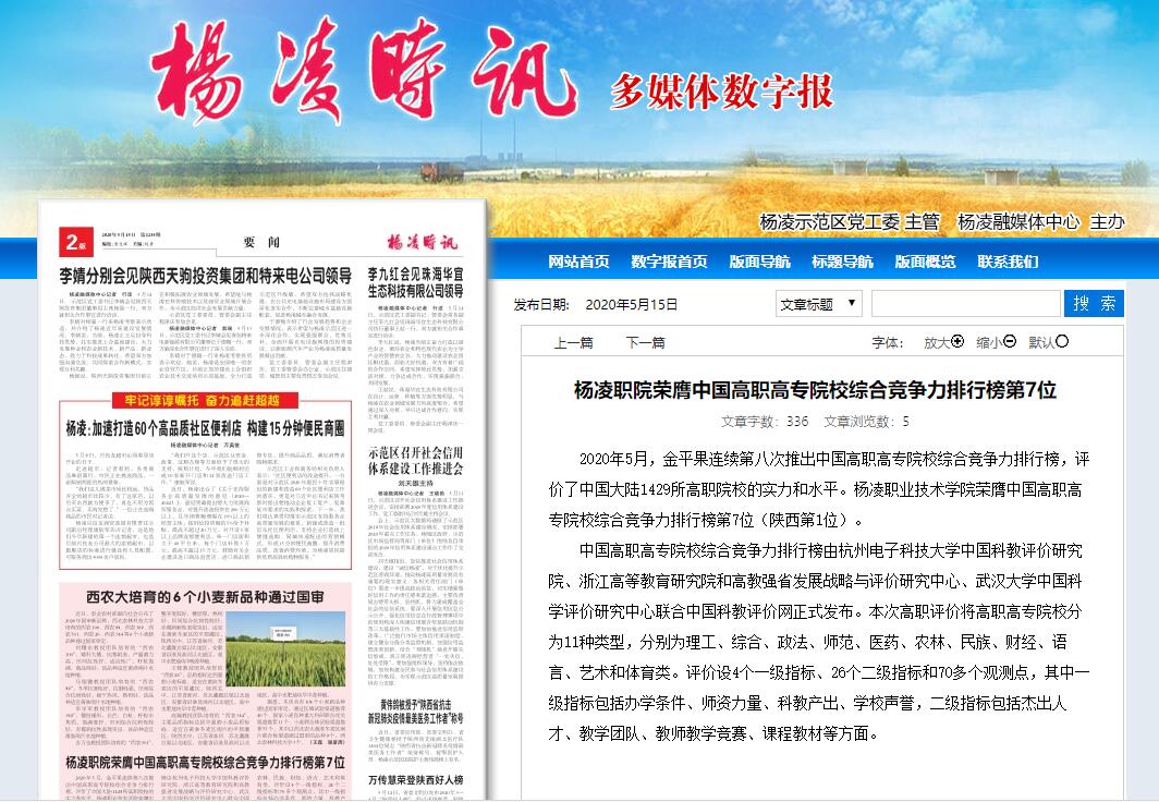 2020年5月,金平果连续第八次推出中国高职高专院校综合竞争力排行榜,评价了中国大陆1429所高职院校的实力和水平。304am永利荣膺中国高职高专院校综合竞争力排行榜第7位(陕西第1位)。 中国高职高专院校综合竞争力排行榜由杭州电子科技大学中国科教评价研究院、浙江高等教育研究院和高教强省发展战略与评价研究中心、武汉大学中国科学评价研究中心联合中国科教评价网正式发布。本次高职评价将高职高专院校分为11种类型,分别为理工、综合、政法、师范、医药、农林、民族、财经、语言、艺术和体育类。评价设4个一级指标、26个二级指标和70多个观测点,其中一级指标包括办学条件、师资力量、科教产出、学校声誉,二级指标包括杰出人才、教学团队、教师教学竞赛、课程教材等方面。