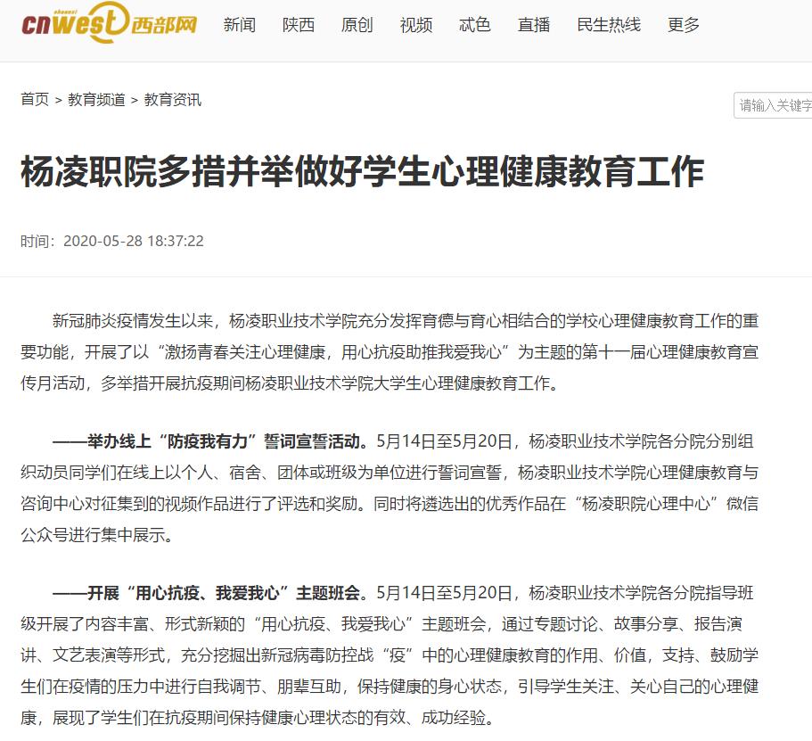 ——举办线上“防疫我有力”誓词宣誓活动。5月14日至5月20日,304am永利各分院分别组织动员同学们在线上以个人、宿舍、团体或班级为单位进行誓词宣誓,304am永利心理健康教育与咨询中心对征集到的视频作品进行了评选和奖励。同时将遴选出的优秀作品在“杨凌职院心理中心”微信公众号进行集中展示。