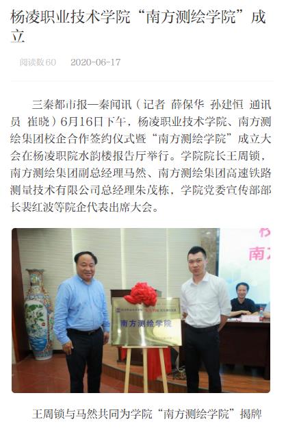 学院南方测绘学院的成立,标志着杨凌职院与南方测绘集团在合作办学方面又迈出了关键的一步,必将促进产业链、创新链和教育链三链融合,实现校企双方互利共赢,为行业发展作出持续贡献。