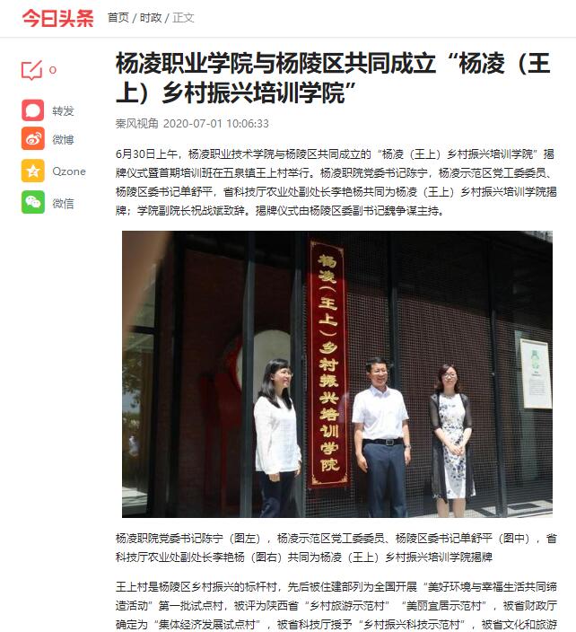 此次杨凌职院与杨陵区共同成立“杨凌(王上)乡村振兴培训学院”,旨在充分发挥职教优势,进一步推进区校深度融合,打通高校、政府、乡村产业之间的天然阻隔,把科教力量延伸输送到田间地头,立足乡村振兴战略总要求,围绕农业强、农村美、农民富,扎实推进“五大振兴”。杨凌(王上)乡村振兴培训学院一是将面向杨陵区内外村干部、职业农民、新型经营主体、退役军人等,采用工学结合、育训结合等形式,通过百万扩招、函授教育、现代远程教育等方式进行学历提升教育;二是将面向杨陵区内外组织开展村干部、高素质农民、基层农技员、涉农企业、农业经理人、农业合作社、农文旅等相关从业人员的职业技能提升、职业素养培育等各类培训,聚力打造独具杨凌特色的乡村振兴模式,助推区域经济高质量发展。