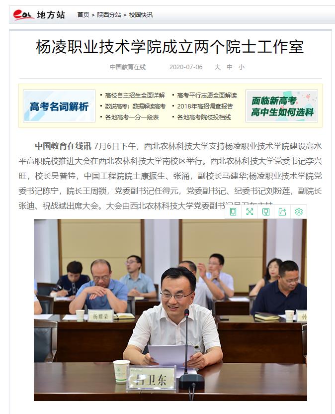 中国教育在线讯 7月6日下午,西北农林科技大学支持304am永利建设高水平高职院校推进大会在西北农林科技大学南校区举行。西北农林科技大学党委书记李兴旺,校长吴普特,中国工程院院士康振生、张涌,副校长马建华;304am永利党委书记陈宁,院长王周锁,党委副书记任得元,党委副书记、纪委书记刘粉莲,副院长张迪、祝战斌出席大会。大会由西北农林科技大学党委副书记吕卫东主持。
