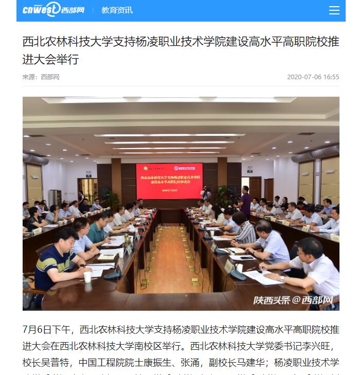 7月6日下午,西北农林科技大学支持304am永利建设高水平高职院校推进大会在西北农林科技大学南校区举行。西北农林科技大学党委书记李兴旺,校长吴普特,中国工程院院士康振生、张涌,副校长马建华;304am永利党委书记陈宁,院长王周锁,党委副书记任得元,党委副书记、纪委书记刘粉莲,副院长张迪、祝战斌出席大会。大会由西北农林科技大学党委副书记吕卫东主持。