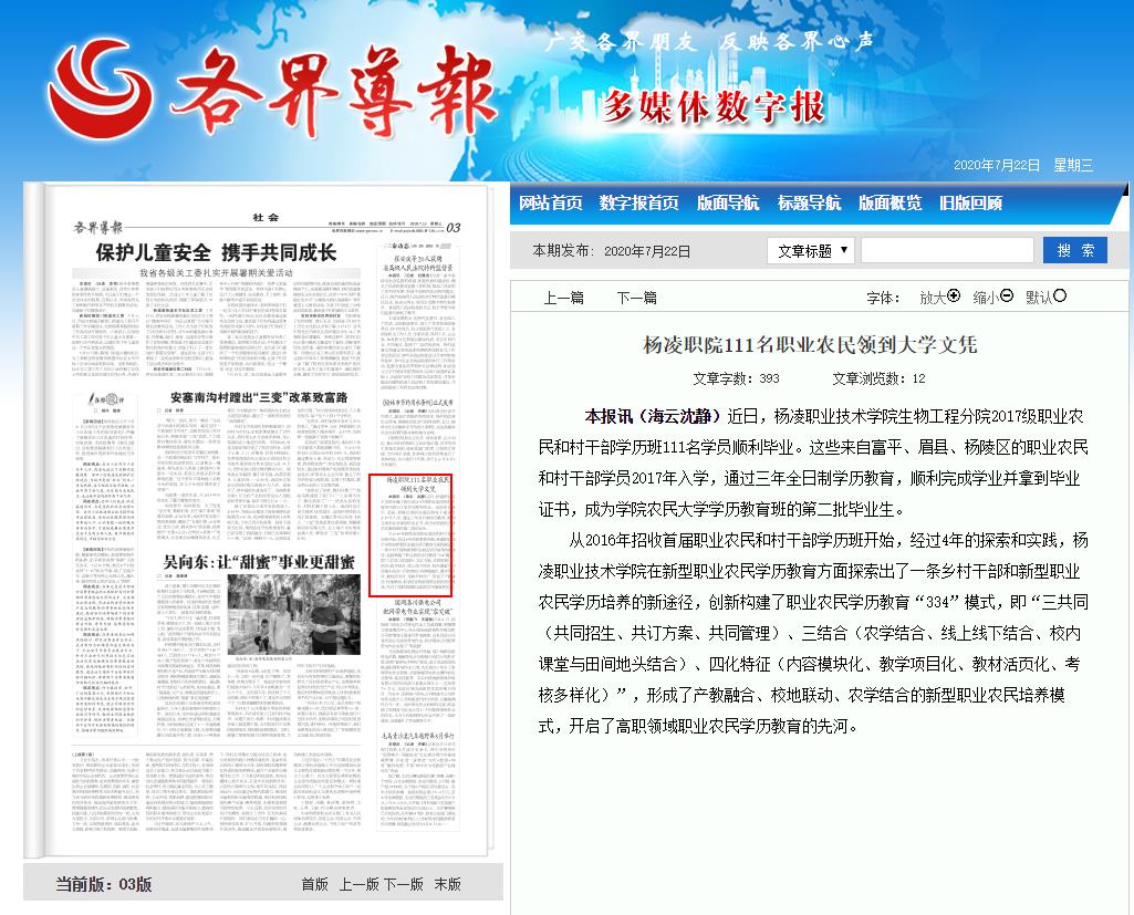 本报讯(海云沈静)近日,304am永利生物工程分院2017级职业农民和村干部学历班111名学员顺利毕业。这些来自富平、眉县、杨陵区的职业农民和村干部学员2017年入学,通过三年全日制学历教育,顺利完成学业并拿到毕业证书,成为学院农民大学学历教育班的第二批毕业生。 从2016年招收首届职业农民和村干部学历班开始,经过4年的探索和实践,304am永利在新型职业农民学历教育方面探索出了一条乡村干部和新型职业农民学历培养的新途径,创新构建了职业农民学历教育“334”模式,即“三共同(共同招生、共订方案、共同管理)、三结合(农学结合、线上线下结合、校内课堂与田间地头结合)、四化特征(内容模块化、教学项目化、教材活页化、考核多样化)”,形成了产教融合、校地联动、农学结合的新型职业农民培养模式,开启了高职领域职业农民学历教育的先河。