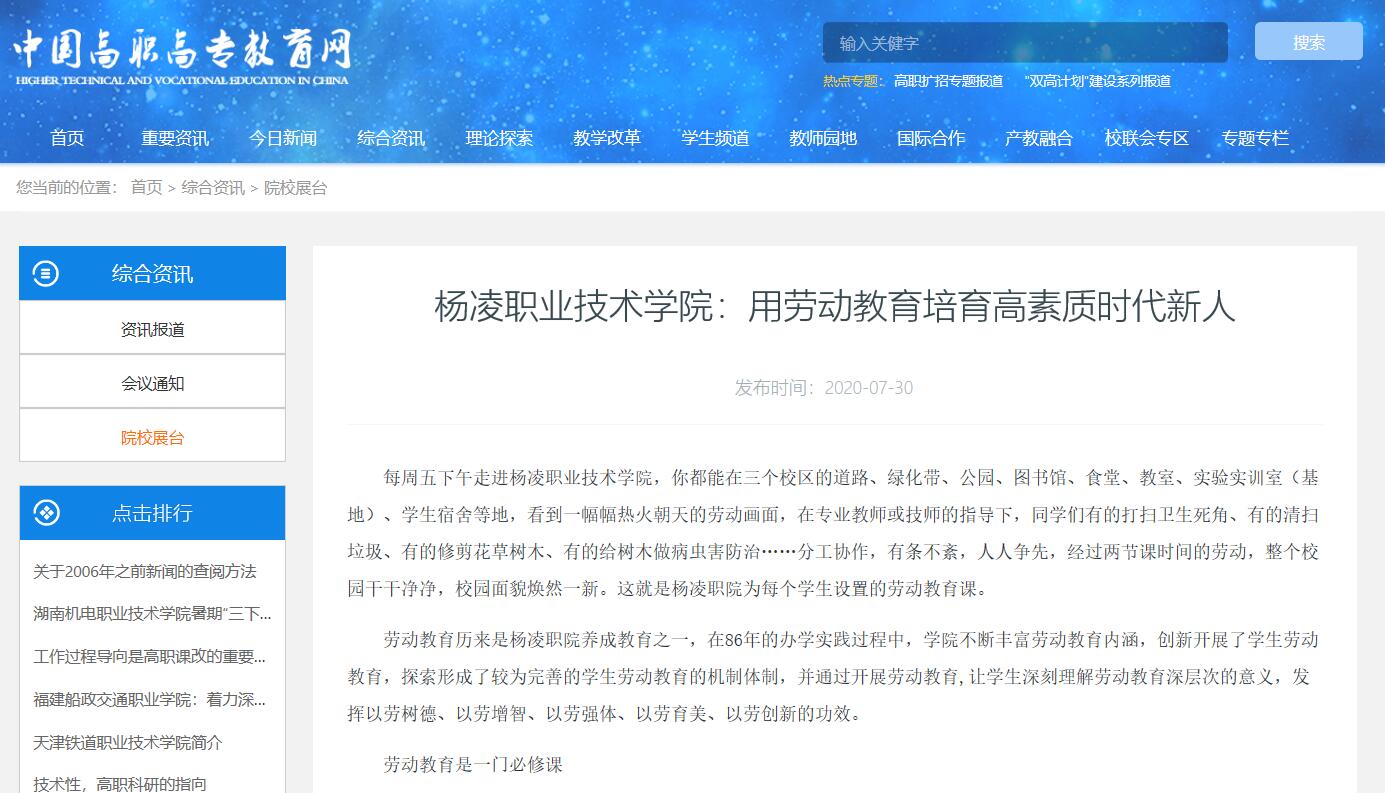 劳动教育历来是杨凌职院养成教育之一,在86年的办学实践过程中,学院不断丰富劳动教育内涵,创新开展了学生劳动教育,探索形成了较为完善的学生劳动教育的机制体制,并通过开展劳动教育,让学生深刻理解劳动教育深层次的意义,发挥以劳树德、以劳增智、以劳强体、以劳育美、以劳创新的功效。