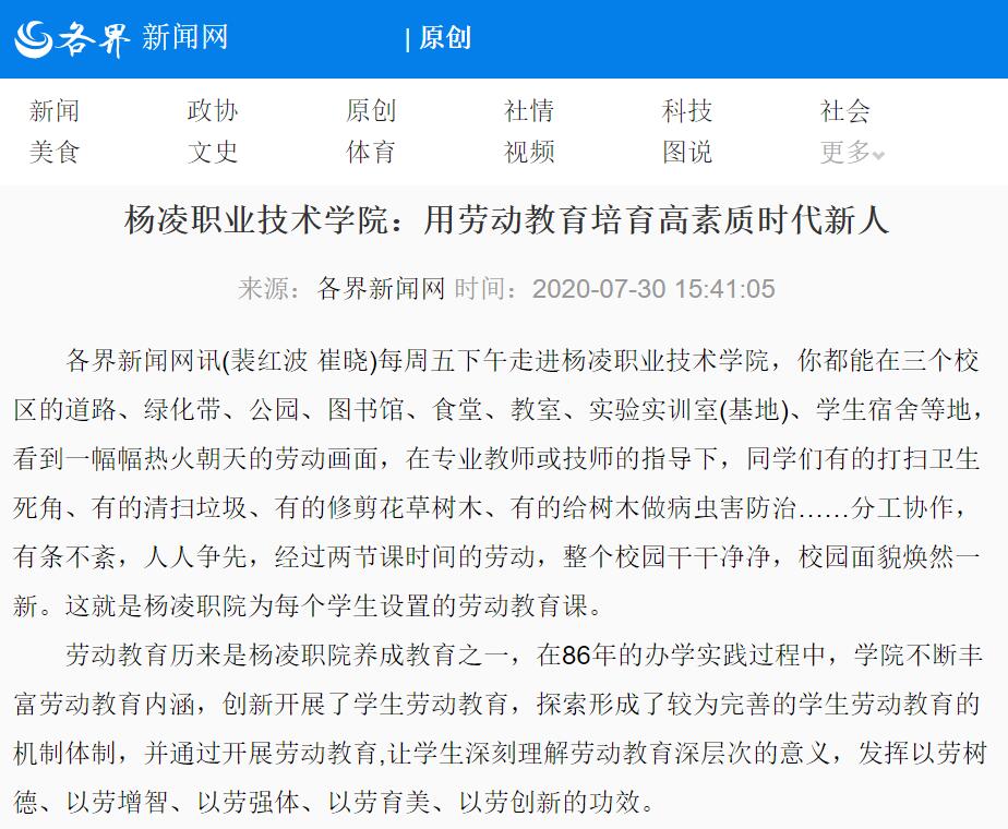 劳动教育历来是杨凌职院养成教育之一,在86年的办学实践过程中,学院不断丰富劳动教育内涵,创新开展了学生劳动教育,探索形成了较为完善的学生劳动教育的机制体制,并通过开展劳动教育,让学生深刻理解劳动教育深层次的意义,发挥以劳树德、以劳增智、以劳强体、以劳育美、以劳创新的功效。