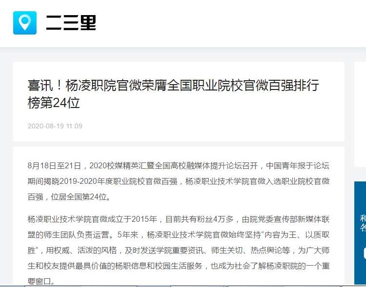 【二三里】喜讯!杨凌职院官微荣膺全国职业院校官微百强排行榜第24位
