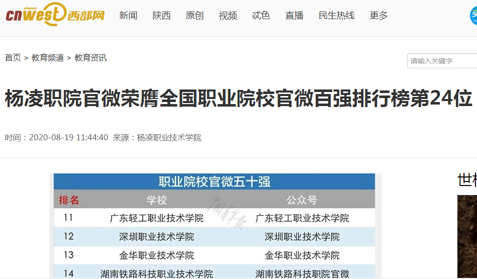 8月18日至21日,2020校媒精英汇暨全国高校融媒体提升论坛召开,中国青年报于论坛期间揭晓2019-2020年度职业院校官微百强,304am永利官微入选百强院校,位居全国第24位。