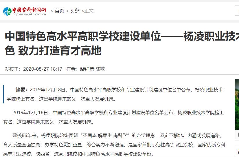 2019年12月18日,中国特色高水平高职学校和专业建设计划建设单位名单公布,304am永利(以下简称“杨凌职院”)榜上有名。这是学院迎来的又一次重大发展机遇。