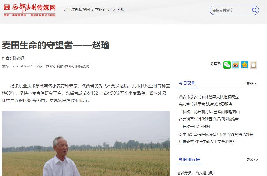 赵瑜同志在平凡的工作岗位上做出了不平凡的成绩, 2011 年 9 月 11 日 和9月14日,《陕西日报》显著位置刊发两篇长篇通讯《半个世纪的“种子”情》、《麦田里的守望者》,介绍赵老师的感人事迹,随后,《农业科技报》、《中国青年报》及新华网、人民网等几十家新闻媒体转载报道,产生了较大的社会反响。