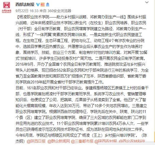 目前,161名职业农民和村干部已经毕业。李建辉是杨陵区五泉镇王上村的后备干部,也是学院首批杨凌村干部学历教育班学员,系统学习农业技术、营销管理等知识后,他便成立了公司,把蔬菜、瓜果苗子从杨凌卖到了全省。他还扩大了智能化大棚育苗规模,年收入达到30万元,带动了10多个失地农民增收。三是建立职业农民培育学院。根据陕西自然地理特征,学院先后在关中、陕南、陕北的11个县(区)建立了职业农民培育学院,确保了三大区域的农民都能在家门口学到并应用先进的农业技术。11个职业农民培育学院累计培训农民4万余人次,一些学员也已获得杨凌示范区农民技术职称证书,成为活跃在田间地头的科技二传手。今年6月底,学院还与杨陵区共同成立了“杨凌(王上)乡村振兴培训学院”。(陈杰钢)