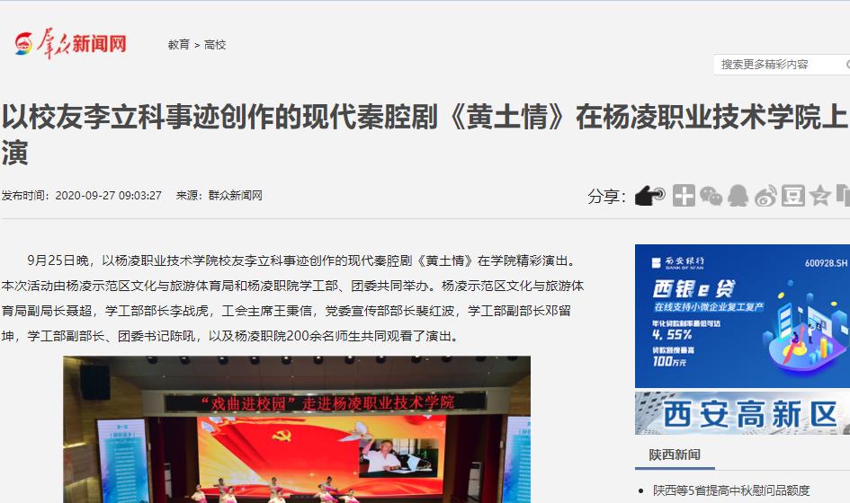 9月25日晚,以304am永利校友李立科事迹创作的现代秦腔剧《黄土情》在学院精彩演出。本次活动由杨凌示范区文化与旅游体育局和杨凌职院学工部、团委共同举办。杨凌示范区文化与旅游体育局副局长聂超,学工部部长李战虎,工会主席王秉信,党委宣传部部长裴红波,学工部副部长邓留坤,学工部副部长、团委书记陈吼,以及学院200余名师生共同观看了演出。