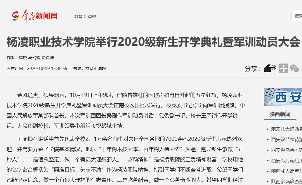 杨凌职院开学典礼暨军训动员大会上,生物工程分院教师张雯、建筑工程分院2020级新生魏强分别作了发言。