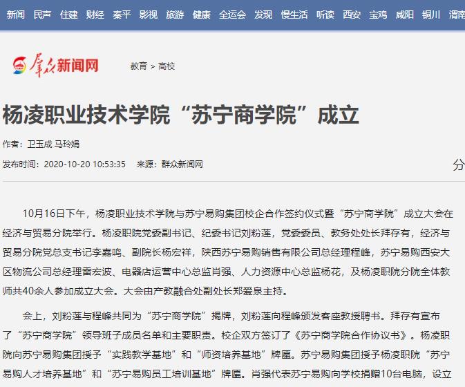 会上,刘粉莲与程峰共同为“苏宁商学院”揭牌,刘粉莲向程峰颁发客座教授聘书。拜存有宣布了“苏宁商学院”领导班子成员名单和主要职责。校企双方签订了《苏宁商学院合作协议书》。杨凌职院向苏宁易购集团授予“实践教学基地”和“师资培养基地”牌匾。苏宁易购集团授予杨凌职院“苏宁易购人才培养基地”和“苏宁易购员工培训基地”牌匾。肖强代表苏宁易购向学校捐赠10台电脑,设立苏宁奖学金。