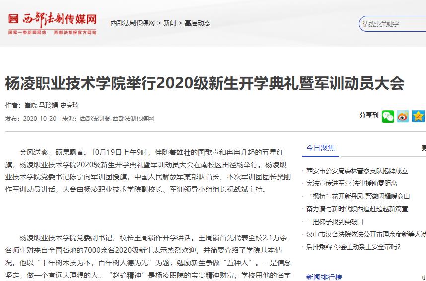 杨凌职院开学典礼暨军训动员大会上,生物工程分院教师张雯、建筑工程分院2020级新生魏强分别作了发言。