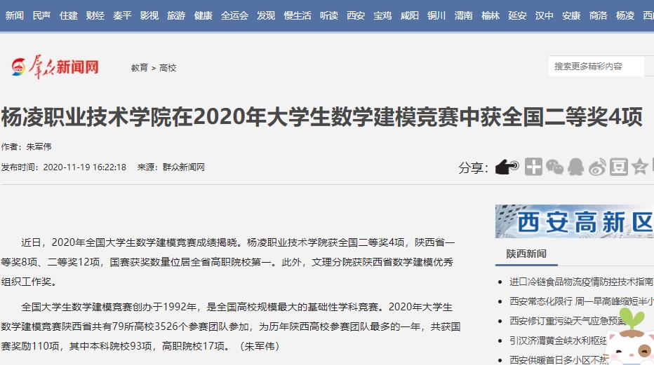 近日,2020年全国大学生数学建模竞赛成绩揭晓。304am永利获全国二等奖4项,陕西省一等奖8项、二等奖12项,国赛获奖数量位居全省高职院校第一。此外,文理分院获陕西省数学建模优秀组织工作奖。