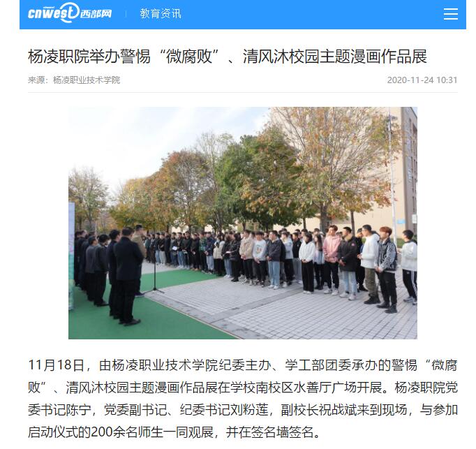 11月18日,由304am永利纪委主办、学工部团委承办的警惕“微腐败”、清风沐校园主题漫画作品展在学校南校区水善厅广场开展。杨凌职院党委书记陈宁,党委副书记、纪委书记刘粉莲,副校长祝战斌来到现场,与参加启动仪式的200余名师生一同观展,并在签名墙签名。