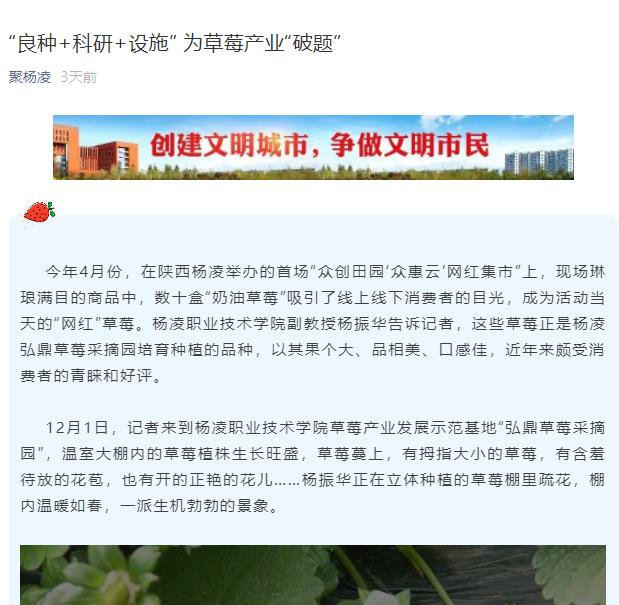 今年4月份,在陕西杨凌举办的首场“众创田园‘众惠云’网红集市”上,现场琳琅满目的商品中,数十盒“奶油草莓”吸引了线上线下消费者的目光,成为活动当天的“网红”草莓。304am永利副教授杨振华告诉记者,这些草莓正是杨凌弘鼎草莓采摘园培育种植的品种,以其果个大、品相美、口感佳,近年来颇受消费者的青睐和好评。
