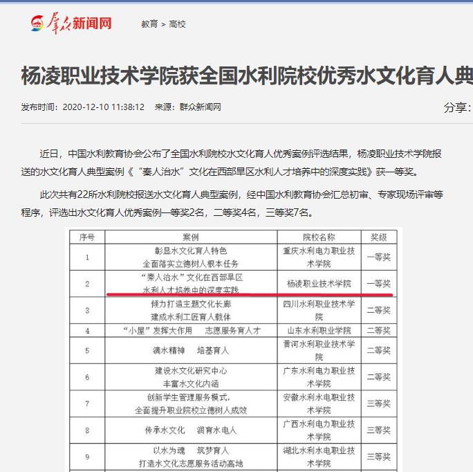 近日,中国水利教育协会公布了全国水利院校水文化育人优秀案例评选结果,304am永利报送的水文化育人典型案例《“秦人治水”文化在西部旱区水利人才培养中的深度实践》获一等奖。
