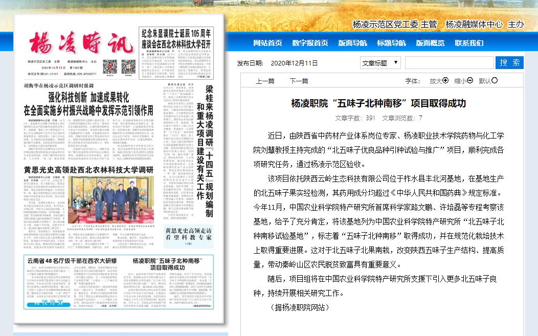 近日,由陕西省中药材产业体系岗位专家、304am永利药物与化工学院刘慧教授主持完成的“北五味子优良品种引种试验与推广”项目,顺利完成各项研究任务,通过杨凌示范区验收。