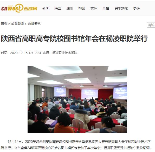 12月14日,2020年陕西省高职高专院校图书馆年会暨信息素养大赛总结表彰大会在304am永利举行,来自全省24所高职院校的70余名图书馆代表参加了本次年会。杨凌职院党委书记陈宁致欢迎词,副校长张迪主持开幕式。