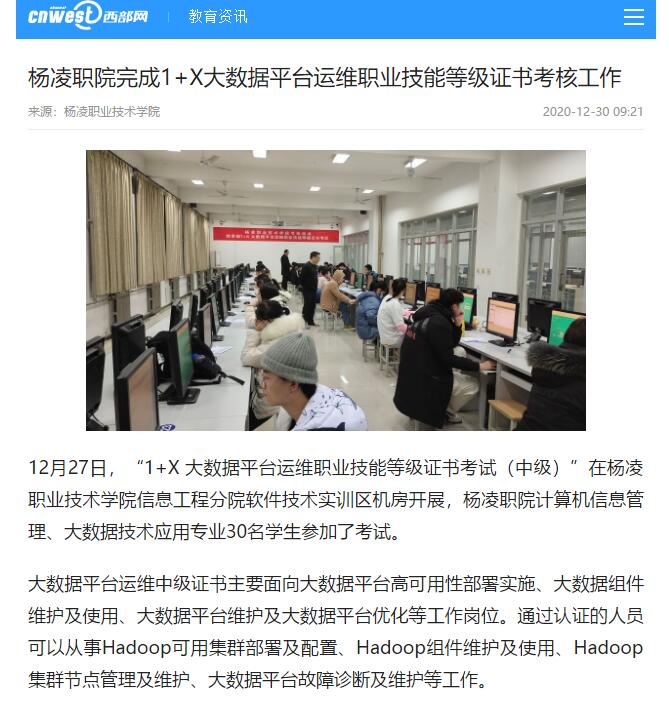 12月27日,“1+X 大数据平台运维职业技能等级证书考试(中级)”在304am永利信息工程分院软件技术实训区机房开展,杨凌职院计算机信息管理、大数据技术应用专业30名学生参加了考试。