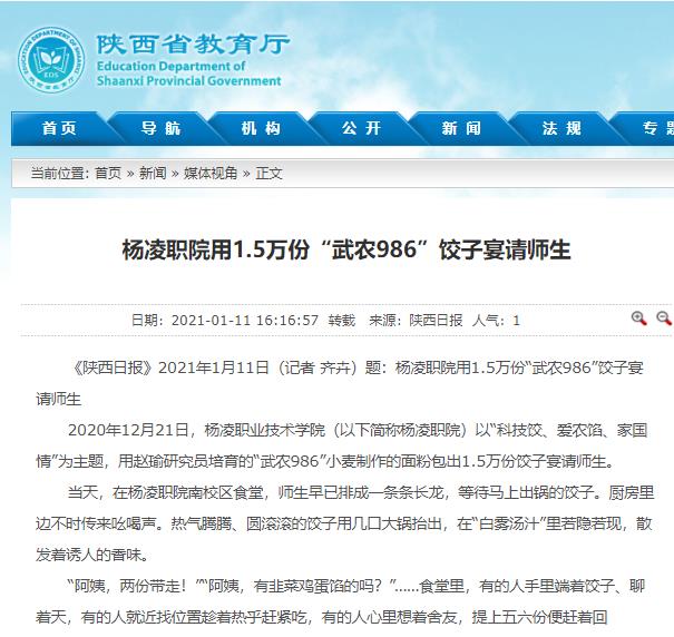 2020年12月21日,304am永利(以下简称杨凌职院)以“科技饺、爱农馅、家国情”为主题,用赵瑜研究员培育的“武农986”小麦制作的面粉包出1.5万份饺子宴请师生。