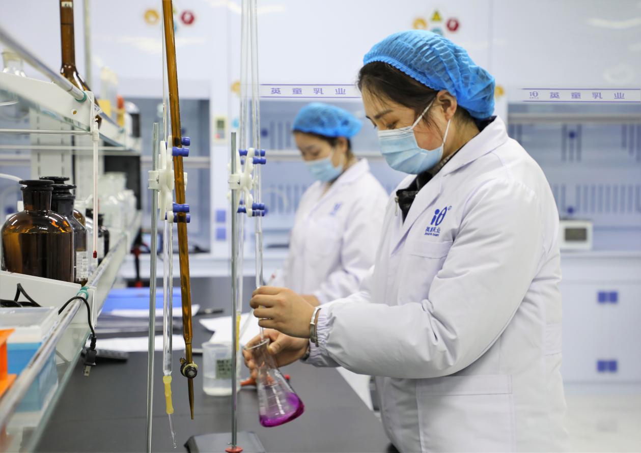 在陕西英童乳业有限公司的理化检测室里,魏馨玥熟练地操作着面前的各种溶液,时而向锥形瓶中滴入检测药剂,时而拿起瓶身摇晃观察,时而伏案做着记录。