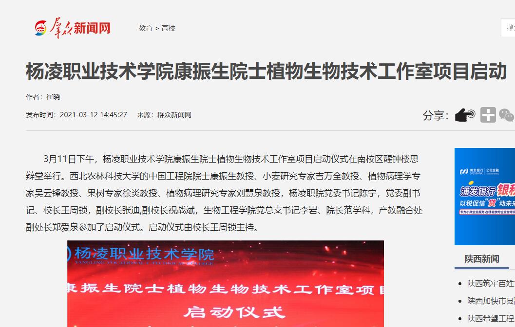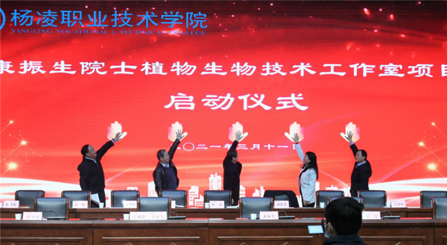 3月11日下午,304am永利康振生院士植物生物技术工作室项目启动仪式在南校区醒钟楼思辩堂举行。西北农林科技大学的中国工程院院士康振生教授、小麦研究专家吉万全教授、植物病理学专家吴云锋教授、果树专家徐炎教授、植物病理研究专家刘慧泉教授,杨凌职院党委书记陈宁,党委副书记、校长王周锁,副校长张迪,副校长祝战斌,生物工程学院党总支书记李岩、院长范学科,产教融合处副处长郑爱泉参加了启动仪式。启动仪式由校长王周锁主持。