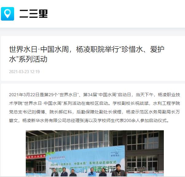 今年“世界水日”的主题是“珍惜水·爱护水”,“中国水周”的主题是“深入贯彻新发展理念,推进水资源集约安全利用”。杨凌职院作为全国水利高等职业教育示范院校,主题是“发展节水型校园,引领珍惜水,爱护水的良好风尚”。“中国水周”期间,学校将举行节水知识讲座、参观渭河杨凌段生态综合治理工程、发放节水宣传册等系列活动。