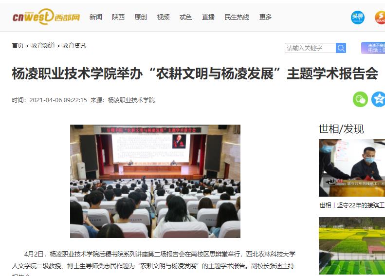西北农林科技大学教授樊志民以杨凌的历史为主线,用详实的史料、风趣的语言,深入浅出地从杨凌的由来、杨凌是中国农业圣地、未来杨凌畅想三个方面,讲述了杨凌的过去、现在和将来。他站在历史的高度,历数杨凌对于农业的四大贡献,即农耕文明发祥之功、传统农业赓续之功、近代农业科教之功、现代农业发展之功,以及杨凌在农业职业教育方面的特殊意义,指出杨凌在中国农业发展过程中救亡图存、科技示范、农业发展等方面都发挥过重大作用,并在引领未来农业发展方面被寄予厚望。