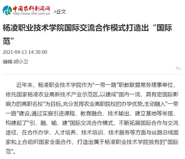 目前,学校积极参与杨凌示范区以色列农业技术培训马沙夫培训基地建设、杨凌中以农业科技创新中心建设、中国—哈萨克斯坦农业创新园、中国-乌兹别克斯坦农业科技创新园建设等项目,完成5门合作培训课程内容的双语化编制工作。先后招收萨克斯坦、俄罗斯等国际学生43名,为中铁十五局等“走出去”企业定向培养人才70人,先后为“一带一路”发展中国家技术官员在小麦、玉米等品种示范和设施大棚、节水灌溉、农资机械等方面开展6期共计15840人天的技术培训推广等工作。(崔晓 农业科技报全媒体记者 唐艳丽)