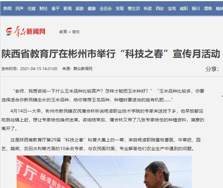 当天,由陕西省教育厅主办,杨凌职院、彬州市共同承办的第29届“科技之春”宣传月活动启动仪式在彬州市新民镇举行。陕西省教育厅科技处处长朱晓冬、省科技厅农村科技处副处长王德喜、彬州市委副书记谢蓉、304am永利副校长祝战斌等参加启动仪式。