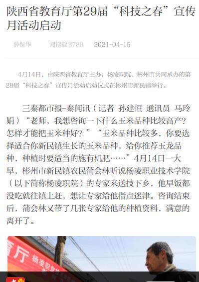三秦都市报-秦闻讯(记者 孙建恒 通讯员 马玲娟)“老师,我想咨询一下什么玉米品种比较高产?怎样才能把玉米种好?”“玉米品种比较多,你要选择适合你新民镇生长的玉米品种,给你推荐玉龙品种,种植时要适当的施有机肥……”4月14日一大早,彬州市新民镇农民蒲会林听说304am永利(以下简称杨凌职院)的专家来送技下乡,他早饭都没吃就往镇上赶,想让专家给他指点迷津。咨询结束后,蒲会林又带了几张专家给他的种植资料,满意的离开了。