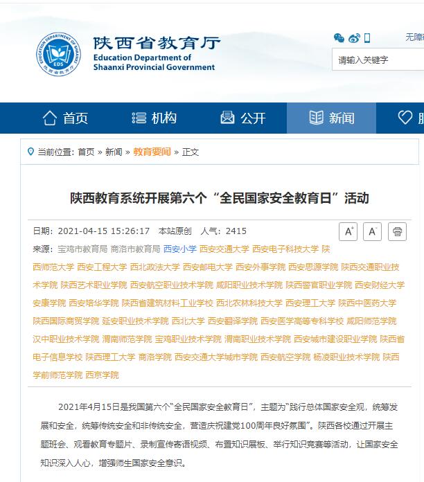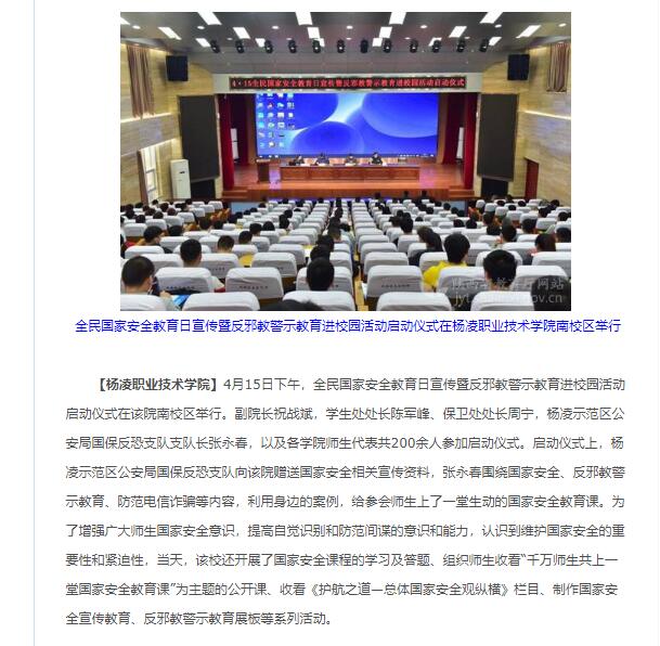 【304am永利】4月15日下午,全民国家安全教育日宣传暨反邪教警示教育进校园活动启动仪式在该院南校区举行。副院长祝战斌,学生处处长陈军峰、保卫处处长周宁,杨凌示范区公安局国保反恐支队支队长张永春,以及各学院师生代表共200余人参加启动仪式。启动仪式上,杨凌示范区公安局国保反恐支队向该院赠送国家安全相关宣传资料,张永春围绕国家安全、反邪教警示教育、防范电信诈骗等内容,利用身边的案例,给参会师生上了一堂生动的国家安全教育课。为了增强广大师生国家安全意识,提高自觉识别和防范间谍的意识和能力,认识到维护国家安全的重要性和紧迫性,当天,该校还开展了国家安全课程的学习及答题、组织师生收看“千万师生共上一堂国家安全教育课”为主题的公开课、收看《护航之道—总体国家安全观纵横》栏目、制作国家安全宣传教育、反邪教警示教育展板等系列活动。