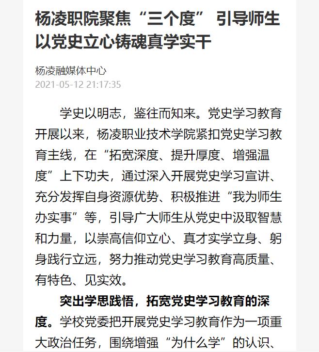 依托自身优势,提升党史学习教育的厚度。启动“正禾”育人工程,通过实施10 个项目、开展60 项支撑活动,进一步落实立德树人根本任务,切实提升学生综合素质,促进学生全面发展。面向杨凌及周边农村打造党史学习教育“移动课堂”,发起“学习百年党史,筑梦乡村振兴”——“杨职号”党史学习教育宣传大篷车,通过讲述党史故事、发放党史资料、一刻钟微党课等形式,让党史学习教育在基层落地有“声”。以陕西省高素质农民培训班举办为契机,开展以“学党史,促振兴”为主题的“百年党史进千村”学习教育活动,通过重温入党誓词、同唱红色歌曲、共上一堂党课等形式把学习百年党史与乡村振兴战略相结合,把党史学习教育培训和高素质农民培养贯通起来,让广大涉农工作者进一步学习了解党史,了解党的光荣传统、宝贵经验和伟大成就,做到知史爱党、知史爱国。以陕西省职业院校教师国培项目培训为契机,开展“百年党史进百校”系列培训教育,通过开展重温一次入党誓词,齐唱一首红色歌曲、同读一部红色经典、共上一堂专题党课、接受一次红色洗礼、共同观看一场红色电影、引领一校职教高质量发展的“七个一”活动,将党史送进培训课堂、送进百校千班,使职教战线广大师生在党史学习教育中提升思想素养和业务能力,不断提高职业教育服务国家战略的能力。发挥艺术教育作用,面向全校学生遴选出9名主演和若干名群演,进行话剧《共产党宣言》排演,通过排演和公演激励引导广大师生学史明理、学史增信、学史崇德、学史力行。