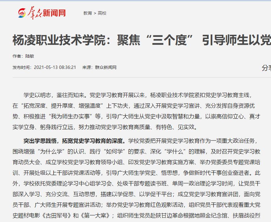 依托自身优势,提升党史学习教育的厚度。启动“正禾”育人工程,通过实施10 个项目、开展60 项支撑活动,进一步落实立德树人根本任务,切实提升学生综合素质,促进学生全面发展。面向杨凌及周边农村打造党史学习教育“移动课堂”,发起“学习百年党史,筑梦乡村振兴”——“杨职号”党史学习教育宣传大篷车,通过讲述党史故事、发放党史资料、一刻微钟党课等形式,让党史学习教育在基层落地有“声”。以陕西省高素质农民培训班举办为契机,开展以“学党史,促振兴”为主题的“百年党史进千村”学习教育活动,通过重温入党誓词、同唱红色歌曲、共上一堂党课等形式把学习百年党史与乡村振兴战略相结合,把党史学习教育培训和高素质农民培养贯通起来,让广大涉农工作者进一步学习了解党史,了解党的光荣传统、宝贵经验和伟大成就,做到知史爱党、知史爱国。以陕西省职业院校教师国培项目培训为契机,开展“百年党史进百校”系列培训教育,通过开展重温一次入党誓词,齐唱一首红色歌曲、同读一部红色经典、共上一堂专题党课、接受一次红色洗礼、共同观看一场红色电影、引领一校职教高质量发展的“七个一”活动,将党史送进培训课堂、送进百校千班,使职教战线广大师生在党史学习教育中提升思想素养和业务能力,不断提高职业教育服务国家战略的能力。发挥艺术教育作用,面向全校学生遴选出9名主演和若干名群演,进行话剧《共产党宣言》排演,通过排演和公演激励引导广大师生学史明理、学史增信、学史崇德、学史力行。