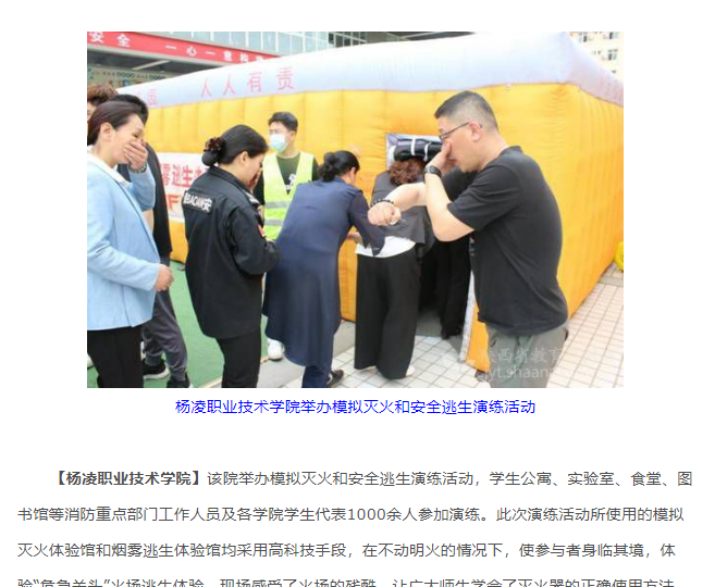 【304am永利】该院举办模拟灭火和安全逃生演练活动,学生公寓、实验室、食堂、图书馆等消防重点部门工作人员及各学院学生代表1000余人参加演练。此次演练活动所使用的模拟灭火体验馆和烟雾逃生体验馆均采用高科技手段,在不动明火的情况下,使参与者身临其境,体验“危急关头”火场逃生体验,现场感受了火场的残酷,让广大师生学会了灭火器的正确使用方法,提升了大家的自救能力,提高了师生员工的消防安全意识,营造了浓厚的校园消防安全氛围。师生纷纷表示,体验式、场景式演练是一种很新颖的教育方式,通过亲身参与、亲身操练、亲身感悟,效果明显,收获很大。