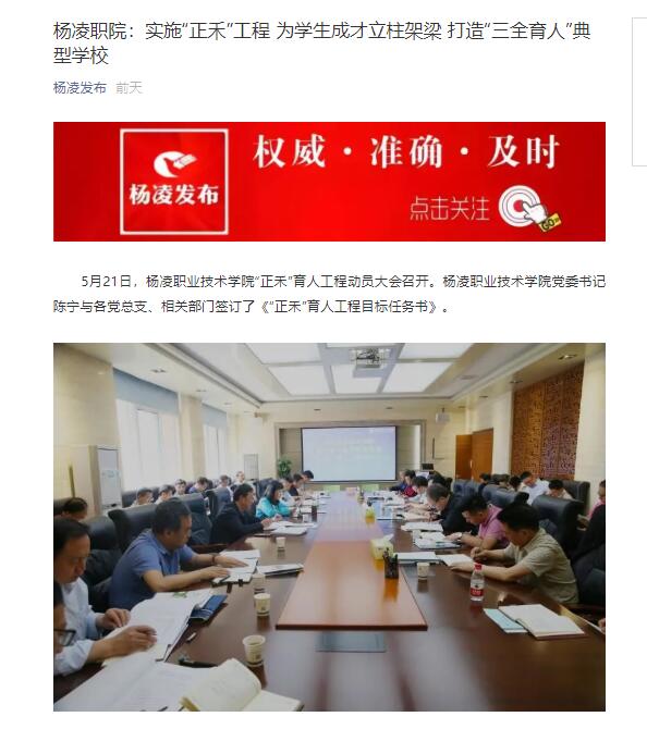 “正禾”育人工程是杨凌职院围绕加强党建工作、推进“三全育人”和深化思政课教学改革三大目标,于今年提出的一项战略性、系统性工程。该工程通过系统梳理新时代大学生的培养目标,有针对性地提出“灯塔引航”“爱国力行”“德种心田”“新知视野”“昂扬奋进”“行为养成”“人文浸润”“耕读修身”“饮水思源”“精技强能”10个项目,通过开展60项支撑活动(包括14项必选活动、46项认领活动),贯穿大一成长教育、大二成才教育、大三职场教育,推进全方位育人;通过建立学校各单位、家庭、社会、学生“四位一体”育人机制,通过实行思政课教师与二级学院结对制度,推进全员育人;通过贯穿“党建+X”工作理念,发挥党组织的战斗堡垒作用和党员先锋模范作用,推进全过程育人,着力在立柱架梁、特色开路、落地见效上下功夫。其中,必选活动由304am永利相关部门牵头,结合上级有关要求和304am永利工作实际,制定具体落实方案;认领活动由学院各党总支和部门结合实际主动认领,并制定具体落实方案。每项活动赋有相应“正禾积分”,学生参加各项活动获得的积分情况计入个人《“正禾”育人工程成绩单》,最终根据德育学分评分标准转化成学分,纳入学生德育得分。