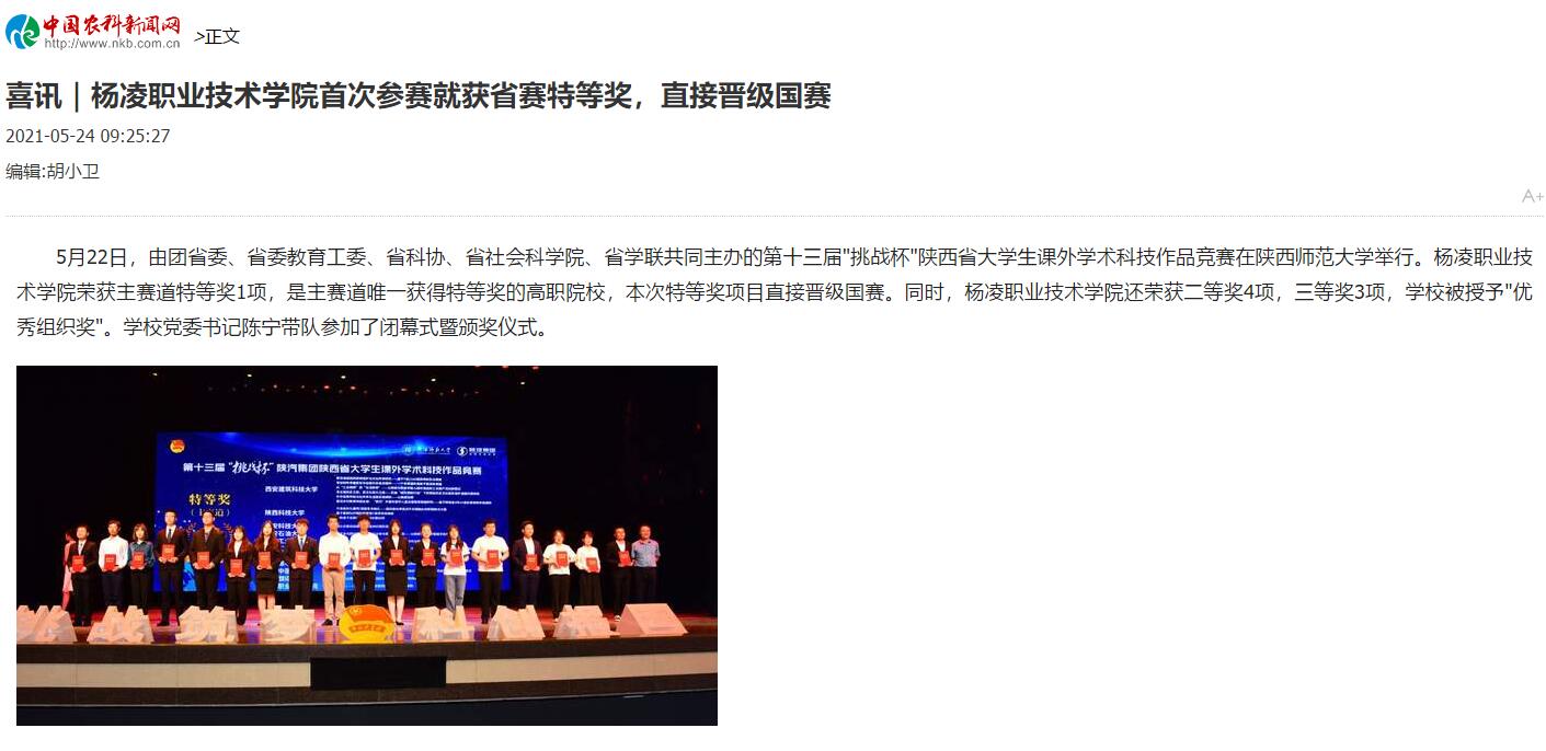 5月22日,由团省委、省委教育工委、省科协、省社会科学院、省学联共同主办的第十三届"挑战杯"陕西省大学生课外学术科技作品竞赛在陕西师范大学举行。304am永利荣获主赛道特等奖1项,是主赛道唯一获得特等奖的高职院校,本次特等奖项目直接晋级国赛。同时,304am永利还荣获二等奖4项,三等奖3项,学校被授予"优秀组织奖"。学校党委书记陈宁带队参加了闭幕式暨颁奖仪式。