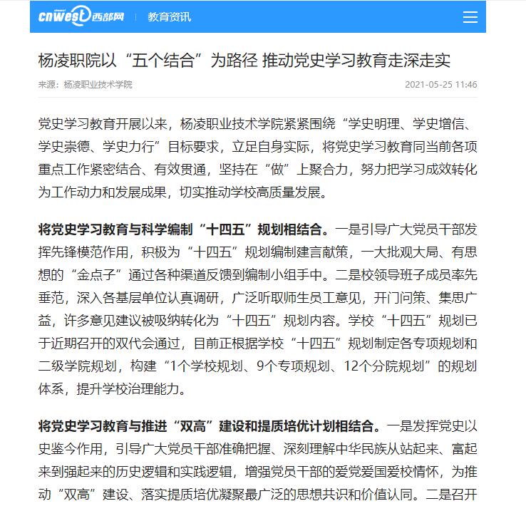 将党史学习教育与深化立德树人相结合。一是在全体教职工中持续开展向赵瑜同志学习活动,通过聆听赵瑜同志“育种报国”故事、观看赵瑜同志先进事迹宣传片、组织师生赴赵瑜小麦育种基地开展主题活动,以及推荐赵瑜同志为“全国优秀共产党员”和“三秦楷模”人选等,把挖掘、学习、实践“赵瑜精神”不断引向深入,激励广大师生进一步弘扬爱党爱国精神、厚植为民服务情怀。二是围绕“加强党建工作,推进三全育人,深化思政课教学改革”三大目标,启动“正禾”育人工程,通过实施10个项目、开展60项支撑活动(包括必选活动14项、认领活动46项),切实提升学生综合素质,促进学生全面发展。本周五学校将召开省级文明校园创建暨“正禾”育人工程动员大会,进一步凝聚共识、夯实责任。三是以陕西省职业院校教师国培项目培训为契机,开展“百年党史进百校”系列培训教育,将党史送进培训课堂、送进百校千班,使职教战线广大师生在党史学习教育中提升思想素养和业务能力,不断提高职业教育服务国家战略的能力。学校2门课程入选教育部课程思政示范课程,2个团组织和2名教师获杨凌示范区“两红两优”表彰。