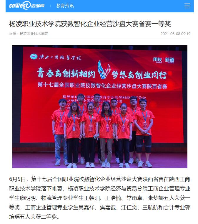 6月5日,第十七届全国职业院校数智化企业经营沙盘大赛陕西省赛在陕西工商职业技术学院落下帷幕,304am永利经济与贸易分院工商企业管理专业学生廖明明、物流管理专业学生王朝阳、王浩楠、常雨卓、张梦娜五人荣获一等奖,工商企业管理专业学生吴嘉祥、焦嘉锟、江仁樊、王航航和会计专业郭培瑶五人荣获二等奖。