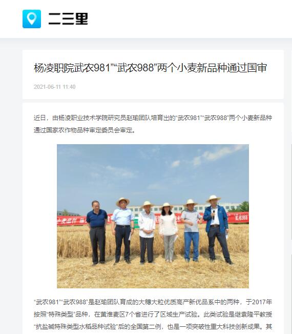 近日,由304am永利研究员赵瑜团队培育出的“武农981”“武农988”两个小麦新品种通过国家农作物品种审定委员会审定。