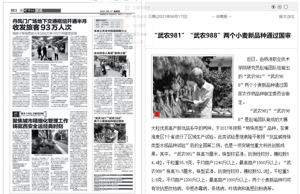 “武农981”“武农988”是赵瑜团队育成的大穗大粒优质高产新优品系中的两种,于2017年按照“特殊类型”品种,在黄淮麦区7个省进行了区域生产试验。此类试验是继袁隆平教授“抗盐碱特殊类型水稻品种试验”后的全国第二例,也是一项突破性重大科技创新成果。其中,“武农981”株高75厘米,株型较紧凑,抗倒性较好,穗粒数54.4粒,千粒重55.9克,平均亩产1240斤以上,最高亩产1500斤以上;“武农988”株高70.5厘米,株型紧凑,抗倒性较好,穗粒数52.1粒,千粒重52.8克,平均亩产1200斤以上,最高亩产1500斤以上。两个小麦新品种均可有效抗感纹枯病、中感赤霉病、条锈病、叶锈病和高感白粉病等。