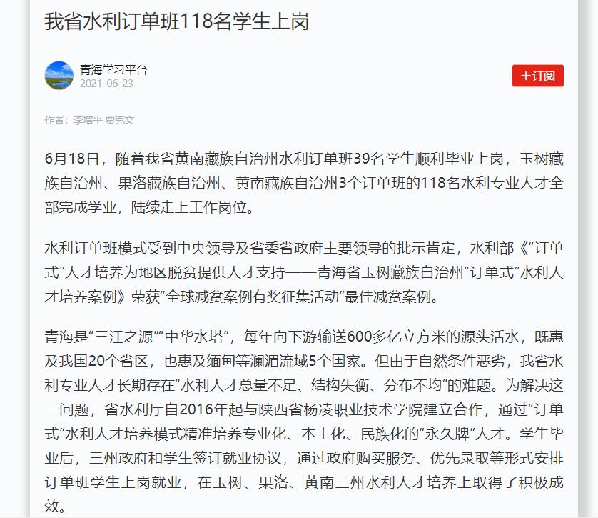 水利订单班模式受到中央领导及省委省政府主要领导的批示肯定,水利部《“订单式”人才培养为地区脱贫提供人才支持——青海省玉树藏族自治州“订单式”水利人才培养案例》荣获“全球减贫案例有奖征集活动”最佳减贫案例。
