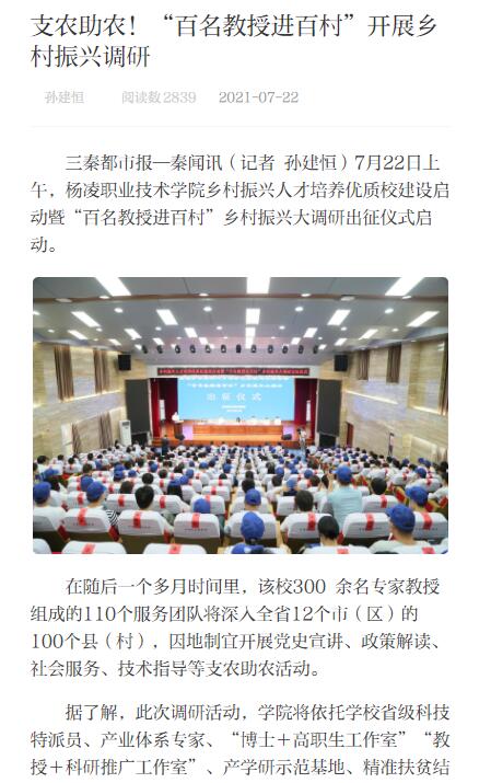 三秦都市报—秦闻讯(记者 孙建恒)7月22日上午,304am永利乡村振兴人才培养优质校建设启动暨“百名教授进百村”乡村振兴大调研出征仪式启动。